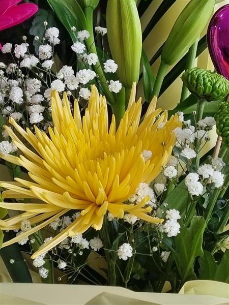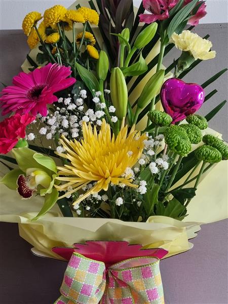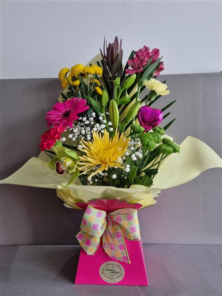 Colourful mix of long lasting flowers arranged in a floral foam. Top up after 2 days with a small glass of water