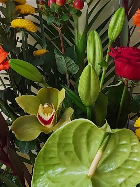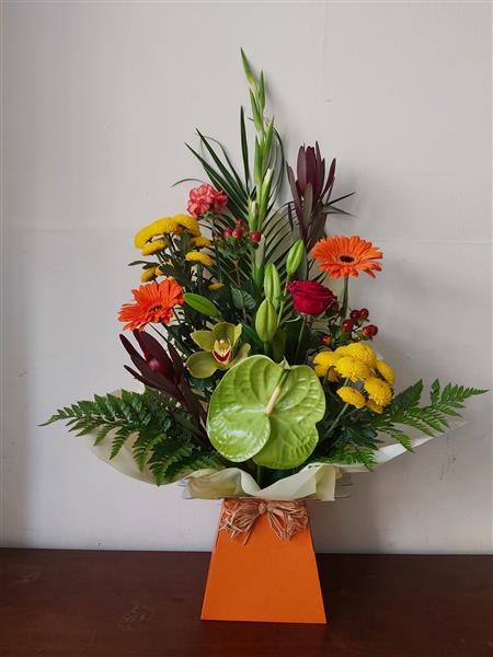 long lasting rich vibrant box, no maintenance apart from a small cup of water, as it is arranged in an oasis approx. 75cm in height. The green anthurium flower will be replaced by another variety of flower in cold temperatures.
