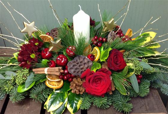 Classic red and gold or silver festive Christmas candle centrepiece.