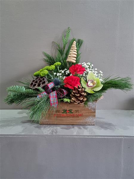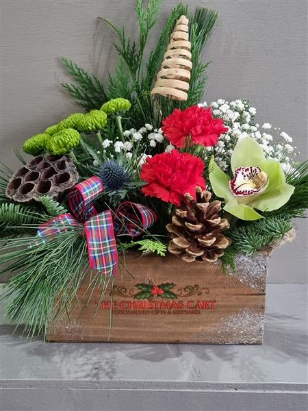 Festive wooden box arranged in a floral foam. Pic is the medium size Height 40cm, width 40cm