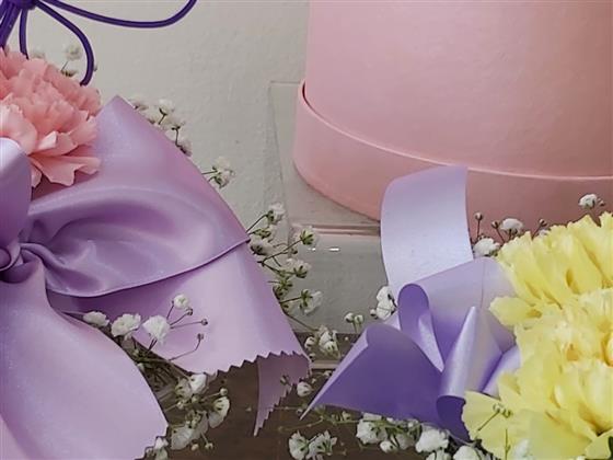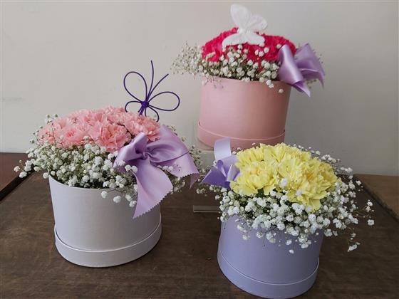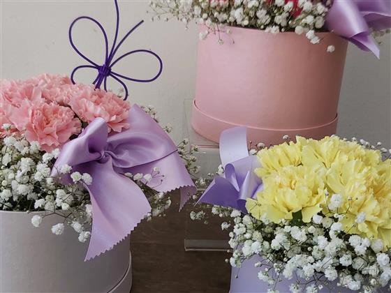 PLEASE ORDER THIS 3 DAYS IN ADVANCE FOR CONTINUITY IN THE COLOUR TONES!!! long lasting colombian carnation and gypsophila hat box. WE CHOOSE THE COLOUR OF FLOWERS AND BOX FOR THIS PRETTY LONG LASTING GIFT.